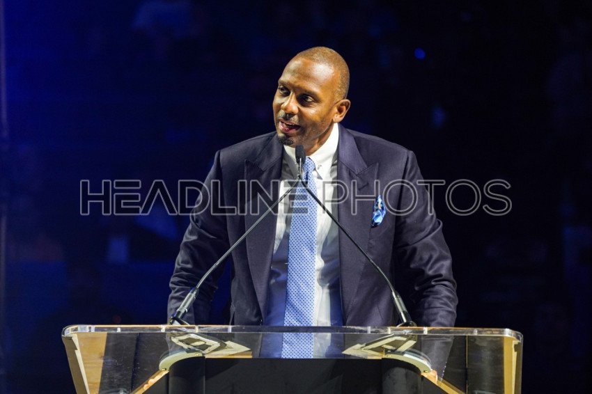 Orlando, Florida, USA, February 13, 2024, Penny Hardaway speaks During the Shaquille O'Neal Jersey Retirement Ceremony at the Kia Center. (Photo Credit: Marty Jean-Louis)