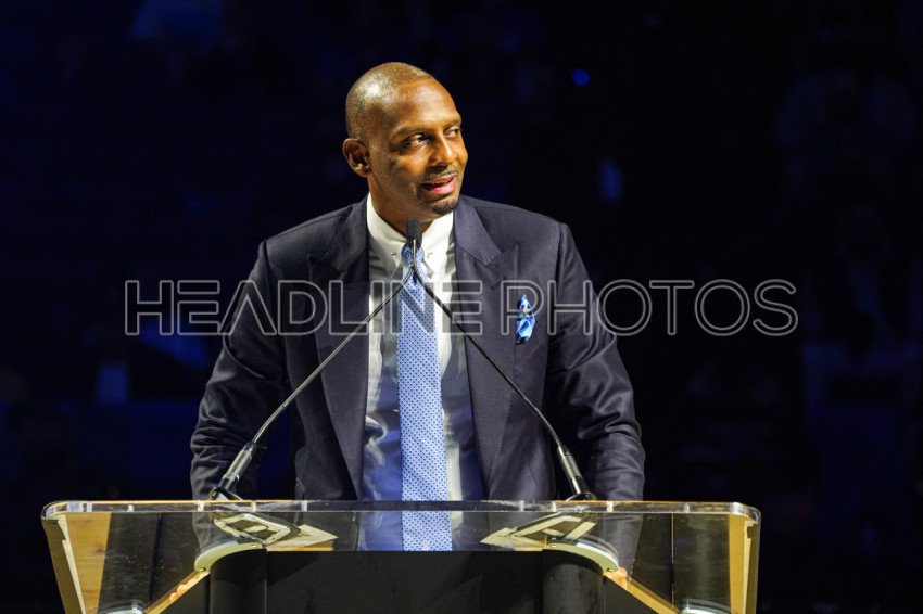 Orlando, Florida, USA, February 13, 2024, Penny Hardaway speaks During the Shaquille O'Neal Jersey Retirement Ceremony at the Kia Center. (Photo Credit: Marty Jean-Louis)