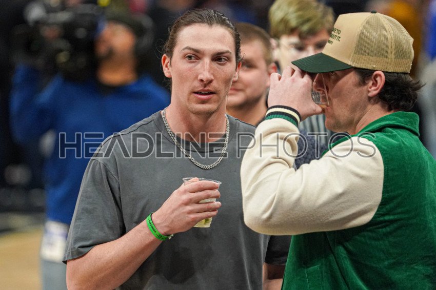 Orlando, Florida, USA, February 27, 2024, Kansas City Chief Punter Tommy Townsend speaking with a friend during the Brooklyn Nets vs Orlando Magic game at the Kia Center. (Photo Credit: Marty Jean-Louis)