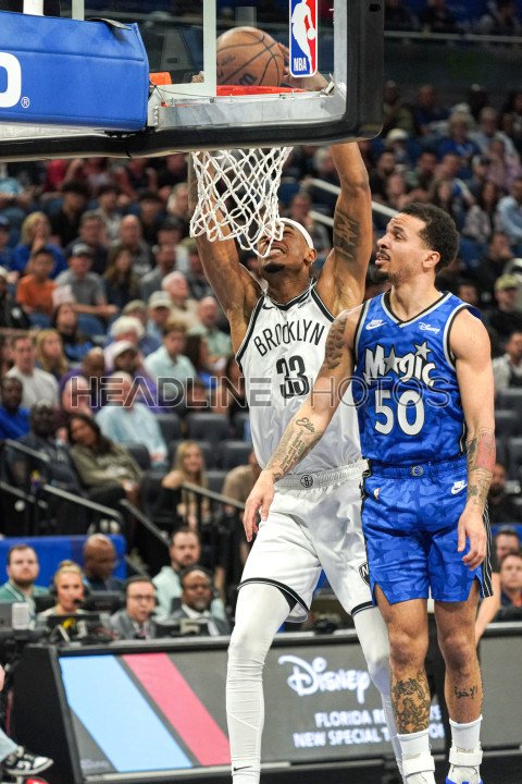Orlando, Florida, USA, March 13, 2024, Brookyn Nets center Nic Claxton #33 makes a dunk in the first half at the Kia Center. (Photo Credit: Marty Jean-Louis)