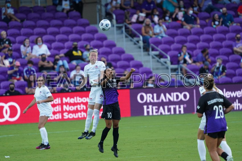 Orlando, Florida, USA, May 16, 2021, Washington Spirit and Orlando Pride players fight for the header at Exploria Stadium (Photo Credit: Marty Jean-Louis)