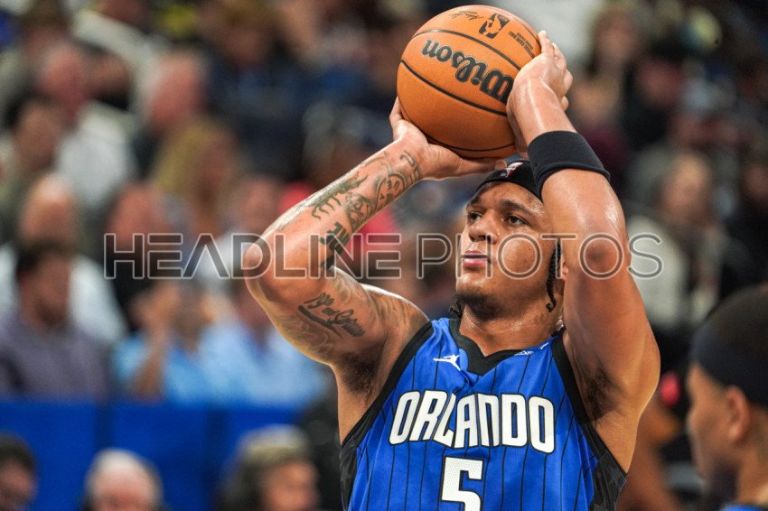 Orlando, Florida, USA, March 27, 2024, Orlando Magic guard Paolo Banchero #5 shoots a free throw at the Kia Center. (Photo Credit: Marty Jean-Louis)