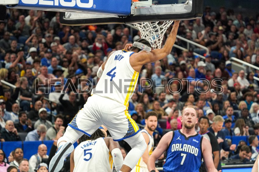 Orlando, Florida, USA, March 27, 2024, Golden State Warriors forward Moses Moody #4 makes a dunk in the second half at the Kia Center. (Photo Credit: Marty Jean-Louis)