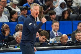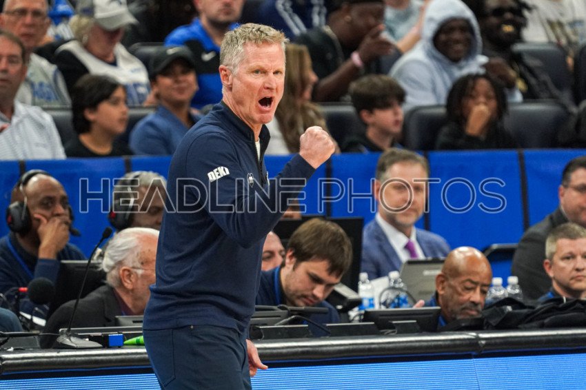 Orlando, Florida, USA, March 27, 2024, Golden State Warriors head coach Steve Kerr celebrate during the second half at the Kia Center. (Photo Credit: Marty Jean-Louis)