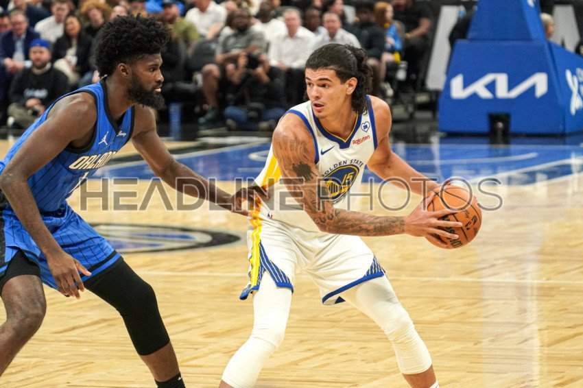 Orlando, Florida, USA, March 27, 2024, Golden State Warriors forward Gui Santos #15 guards the ball as Jonathan Isaac #1 approaches during the second half at the Kia Center. (Photo Credit: Marty Jean-Louis)