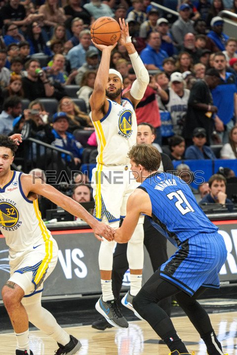 Orlando, Florida, USA, March 27, 2024, Golden State Warriors forward Moses Moody #4 shoots a three in the second half at the Kia Center. (Photo Credit: Marty Jean-Louis)
