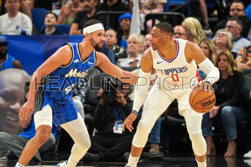 Orlando, Florida, USA, March 29, 2024, Los Angeles Clippers guard Russell Westbrook #0 faces Jalen Suggs #4 during the first half at the Kia Center. (Photo Credit: Marty Jean-Louis)