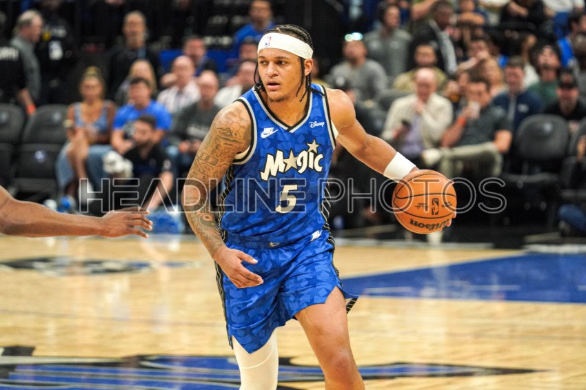 Orlando, Florida, USA, March 30, 2024, Orlando Magic forward Paolo Banchero #5 ruhes forward at the Kia Center. (Photo Credit: Marty Jean-Louis)