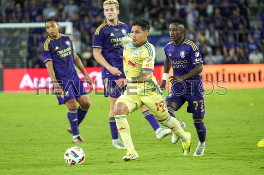 Orlando, Florida, USA, March 30, 2024, New York Red Bulls midfielder Wikelman Carmona #19 rushes upfield past Orlando players at Inter&Co Stadium. (Photo Credit: Marty Jean-Louis)