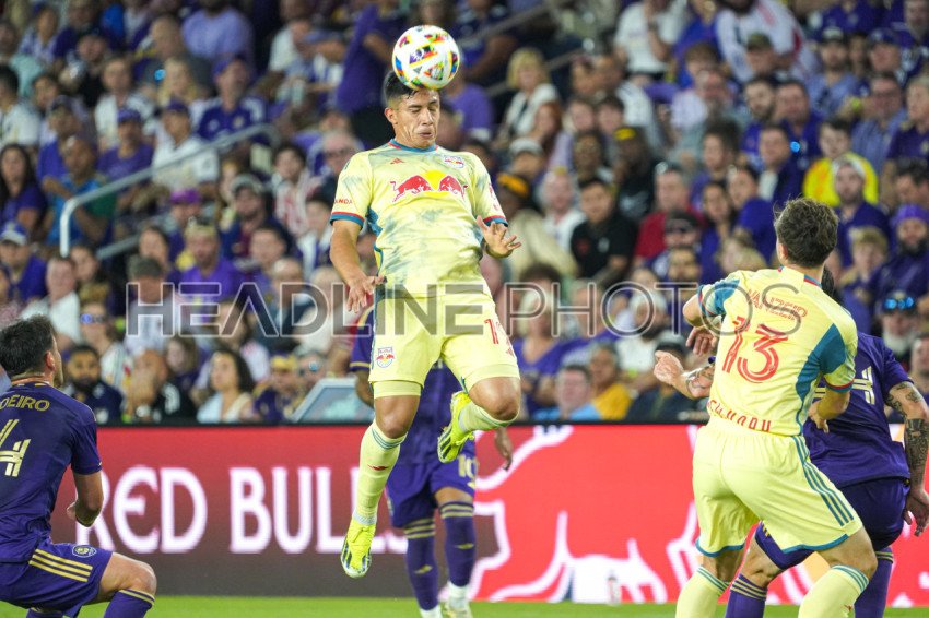 Orlando, Florida, USA, March 30, 2024, New York Red Bulls midfielder Wikelman Carmona #19 wins the header at Inter&Co Stadium. (Photo Credit: Marty Jean-Louis)