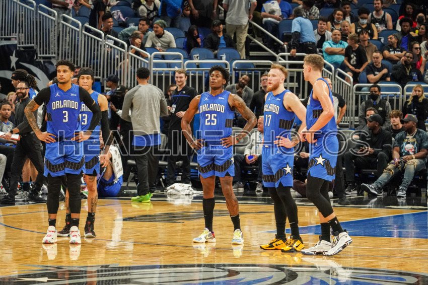 Orlando, Florida, USA, March 15, 2022, Orlando Magic lines up after a time out during the second half at the Amway Center. (Photo Credit: Marty Jean-Louis)