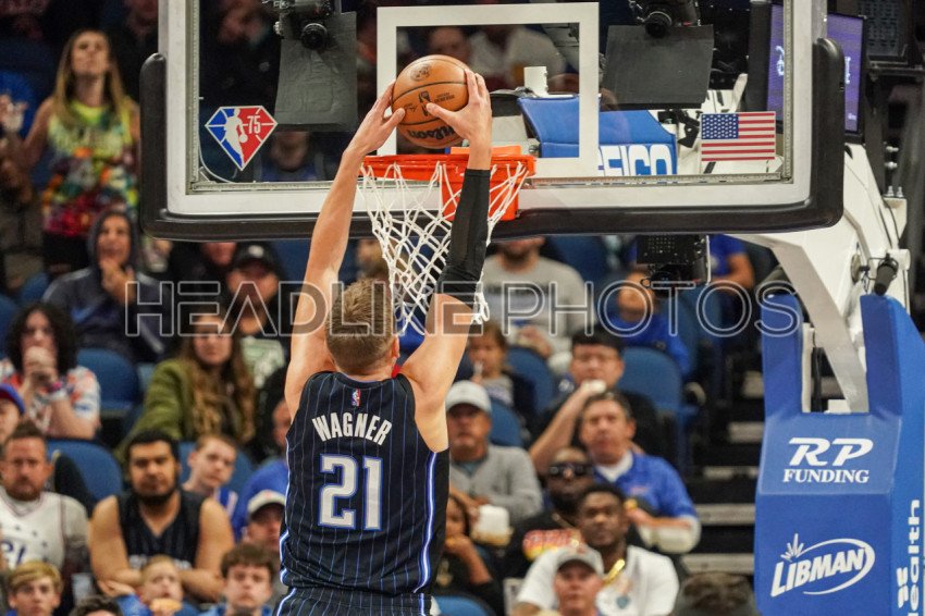 Orlando, Florida, USA, March 13, 2022, Orlando Magic Center Moritz Wagner #21 makes a dunk against the Philadelphia 76ers during the first half at the Amway Center. (Photo Credit: Marty Jean-Louis)