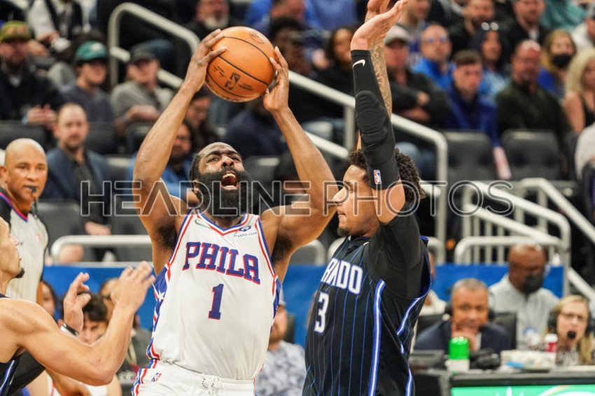 Orlando, Florida, USA, March 13, 2022, Philadelphia 76ers Shooting Guard James Harden #1 attempt to make a basket during the first half at the Amway Center. (Photo Credit: Marty Jean-Louis)