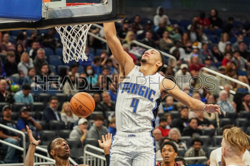 Orlando, Florida, USA, February 16, 2022, Orlando Magic Shooting Guard JALEN\nSUGGS #4 attempt to make a dunk during the second half at the Amway Center. (Photo Credit: Marty Jean-Louis)