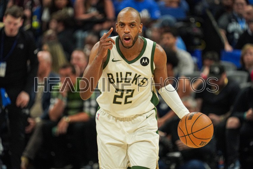 Orlando, Florida, USA, April 14, 2024, Milwaukee Bucks forward Khris Middleton #22 makes a sign to his team mates at the Kia Center. (Photo Credit: Marty Jean-Louis)