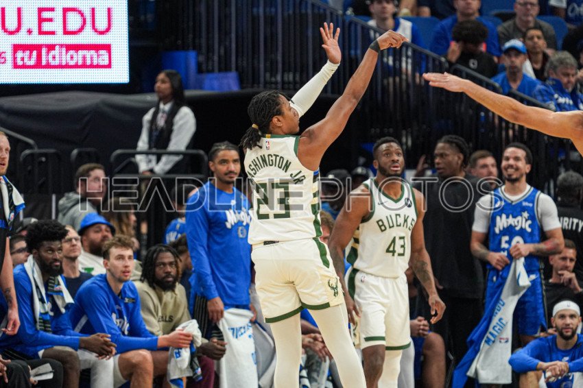 Orlando, Florida, USA, April 14, 2024, Milwaukee Bucks guard TyTy Washington Jr #23 shoots a three at the Kia Center. (Photo Credit: Marty Jean-Louis)