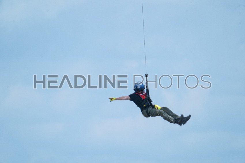Sanford, Florida, USA, April 21, 2024, US Coast Guard Rescue swimmer demonstrating a save During the 2024 Orlando Air Show at the Orlando, Sanford International Airport. (Photo Credit: Marty Jean-Louis)