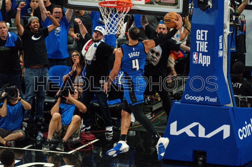 Orlando, Florida, USA, April 22, 2024, Orlando Magic player Jalen Suggs #4 makes a dunk as the crowd cheers during the NBA Playoff at the Kia Center. (Photo Credit: Marty Jean-Louis)