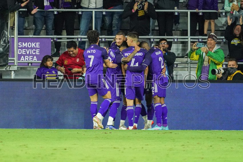 Orlando, Florida, USA, March 12, 2022, Orlando City SC players celebrate after Junio Urso #11 scores in the first half at Exploria Stadium. (Photo Credit: Marty Jean-Louis)