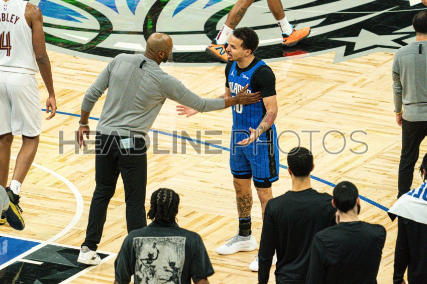 Orlando, Florida, USA, April 22, 2024, Orlando Magic head coach Jamahl Mosley speaking with Cole Anthony #50 during the NBA Playoff at the Kia Center. (Photo Credit: Marty Jean-Louis)