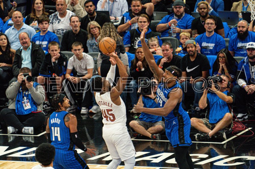 Orlando, Florida, USA, April 22, 2024, Cleveland Cavaliers guard Donovan Mitchell #45 attempt to score while Wendell Carter Jr #34 attempt to block during the NBA Playoff at the Kia Center. (Photo Credit: Marty Jean-Louis)