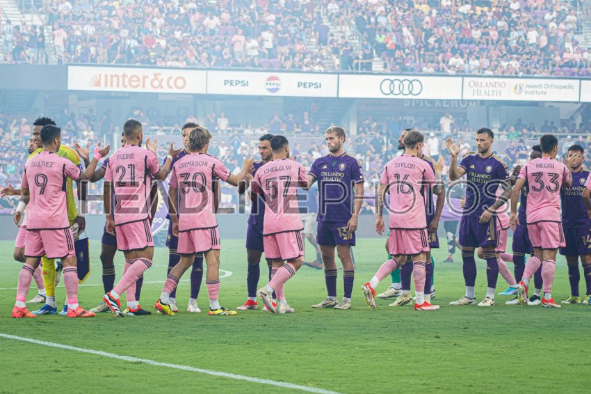 Orlando, Florida, USA, May 15, 2024, Inter Miami and Orlando City players salute each other before the start o the match at Inter&Co Stadium. (Photo Credit: Marty Jean-Louis)