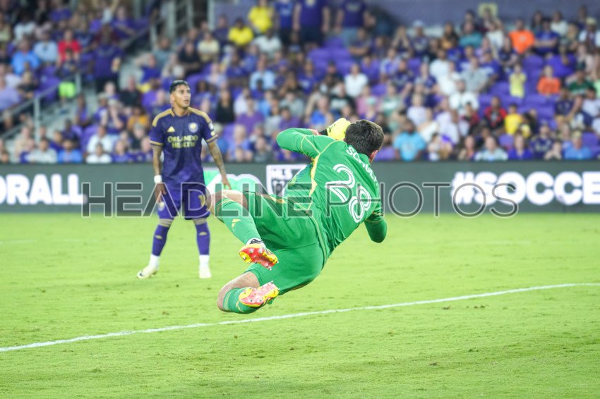 Orlando, Florida, USA, May 25, 2024, Columbus Crew goalkeeper Patrick Schulte #28 jump after the ball during the match at Inter&Co Stadium. (Photo Credit: Marty Jean-Louis)