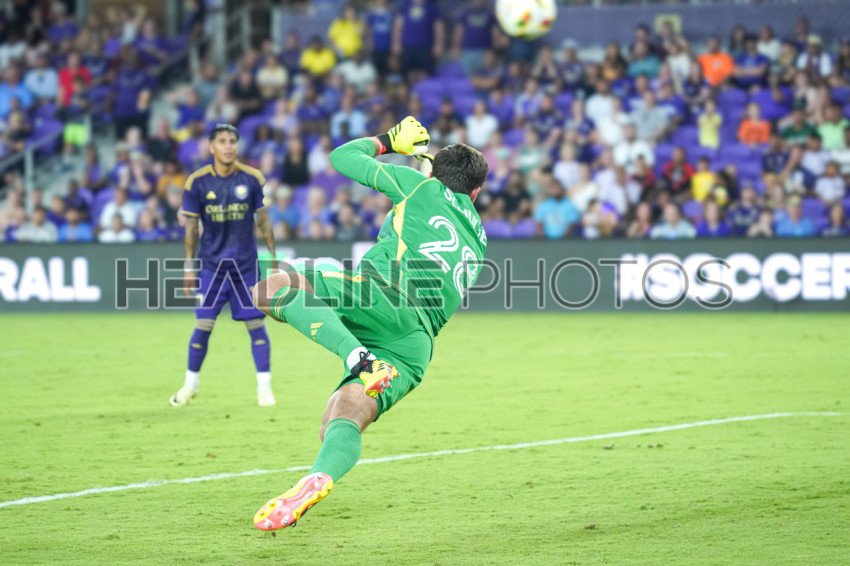Orlando, Florida, USA, May 25, 2024, Columbus Crew goalkeeper Patrick Schulte #28 jump after the ball during the match at Inter&Co Stadium. (Photo Credit: Marty Jean-Louis)