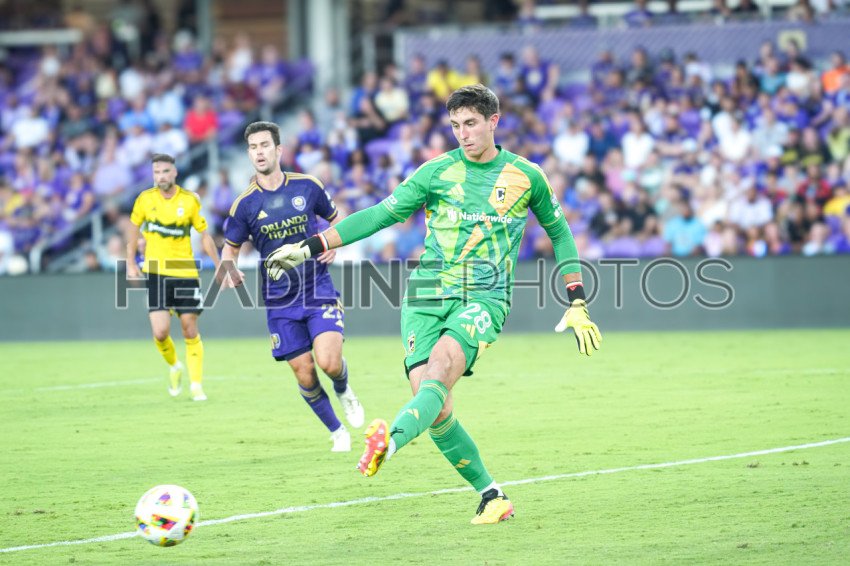 Orlando, Florida, USA, May 25, 2024, Columbus Crew goalkeeper Patrick Schulte #28 makes a pass at Inter&Co Stadium. (Photo Credit: Marty Jean-Louis)