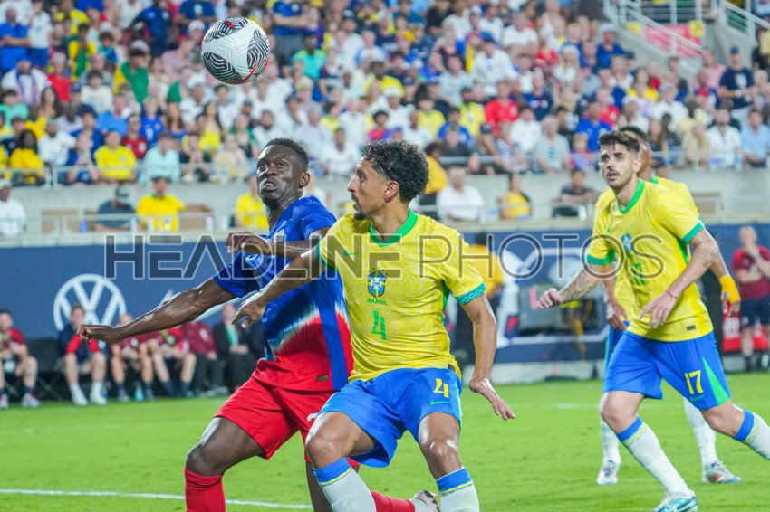 Orlando, Florida, June 12, 2024, Brazil player Marquinhos #4 and Tim Weah #21 fight for the ball at Camping World Stadium. (Photo Credit: Marty Jean-Louis)