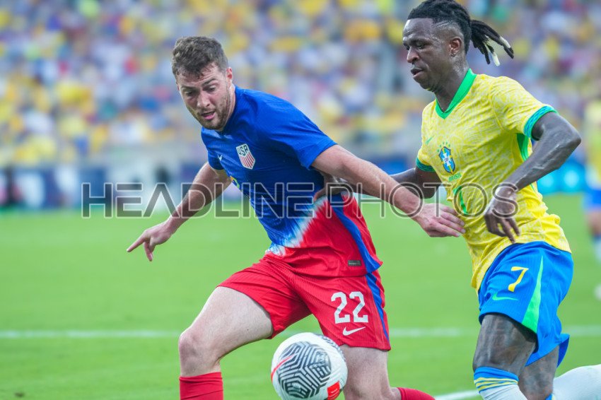Orlando, Florida, June 12, 2024, Brazil player Vinicius Jr #7 and Joe Scally #22 fight for the ball at Camping World Stadium. (Photo Credit: Marty Jean-Louis)