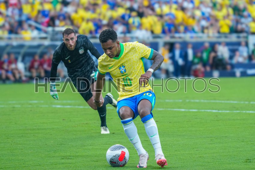 Orlando, Florida, June 12, 2024, Brazil forward Rodrygo #10 attempt to score while Matt Turner runs after the ball at Camping World Stadium. (Photo Credit: Marty Jean-Louis)
