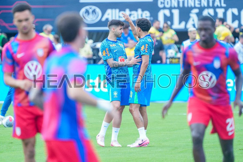 Orlando, Florida, June 12, 2024, Brazil players having a conversation during warmup at Camping World Stadium. (Photo Credit: Marty Jean-Louis)