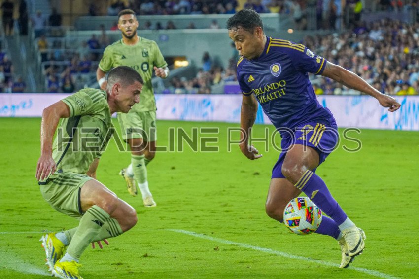 Orlando, Florida, USA, June 15, 2024, Orlando City SC forward Luis Muriel #9 attempt to run pass Galaxy defender at Inter&Co Stadium. (Photo Credit: Marty Jean-Louis)
