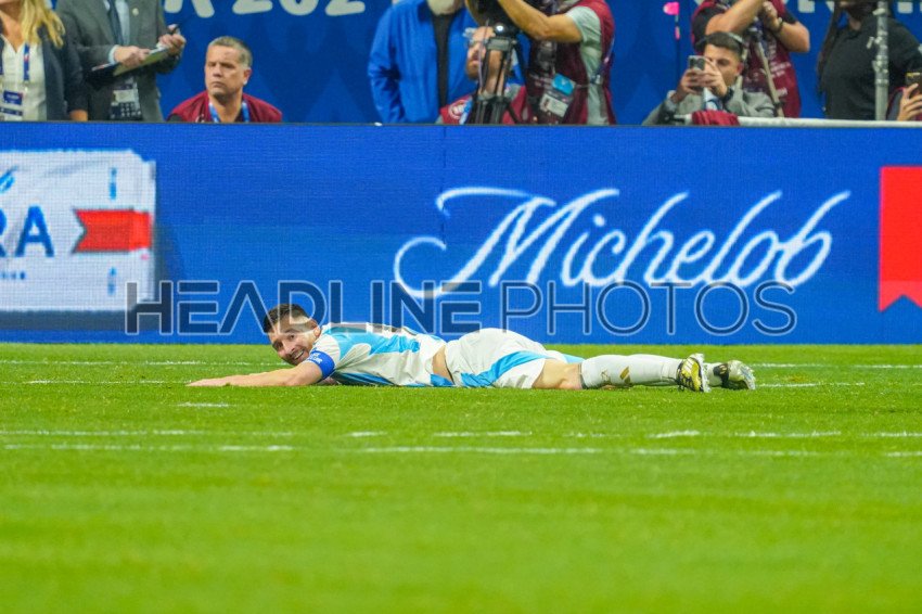 Atlanta, Georgia, USA, June 20, 2024, Argentina forward Lionel Messi #10 smiling while on the grass during the 2024 Copa America at Mercedes-Benz Stadium. (Photo Credit: Marty Jean-Louis)