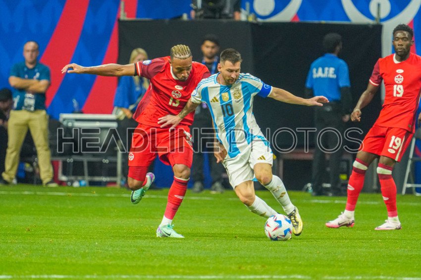 Atlanta, Georgia, USA, June 20, 2024, Argentina forward Lionel Messi #10 controls the ball as Derek Cornelius #13 ads pressure during the 2024 Copa America at Mercedes-Benz Stadium. (Photo Credit: Marty Jean-Louis)