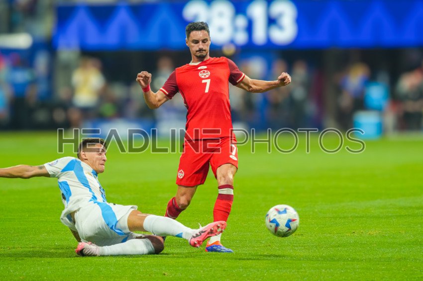 Atlanta, Georgia, USA, June 20, 2024, Argentina's Nahuel Molina #26 makes a slide tackle and kick the ball out from Stephen Eustáquio #7 during the 2024 Copa America at Mercedes-Benz Stadium. (Photo Credit: Marty Jean-Louis)