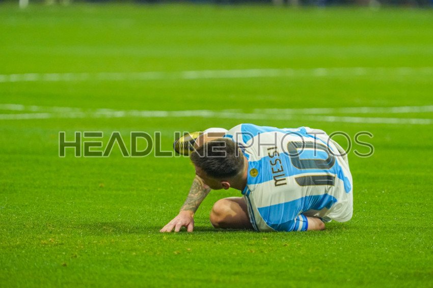 Atlanta, Georgia, USA, June 20, 2024, Argentina forward Lionel Messi #10 on the ground in pain during the 2024 Copa America at Mercedes-Benz Stadium. (Photo Credit: Marty Jean-Louis)