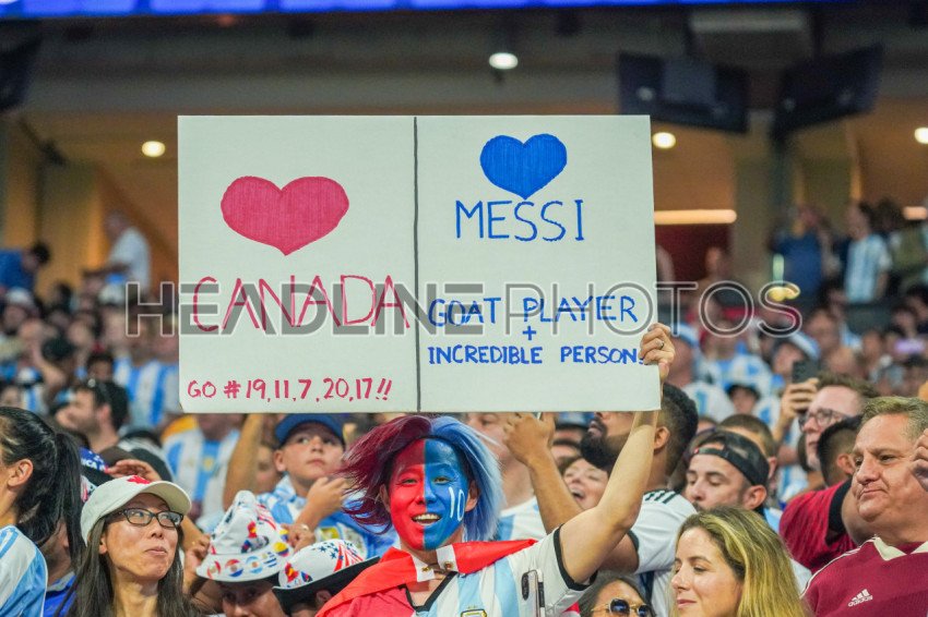 Atlanta, Georgia, USA, June 20, 2024, Canada and Argentina fan holding a sign during the 2024 Copa America at Mercedes-Benz Stadium. (Photo Credit: Marty Jean-Louis)