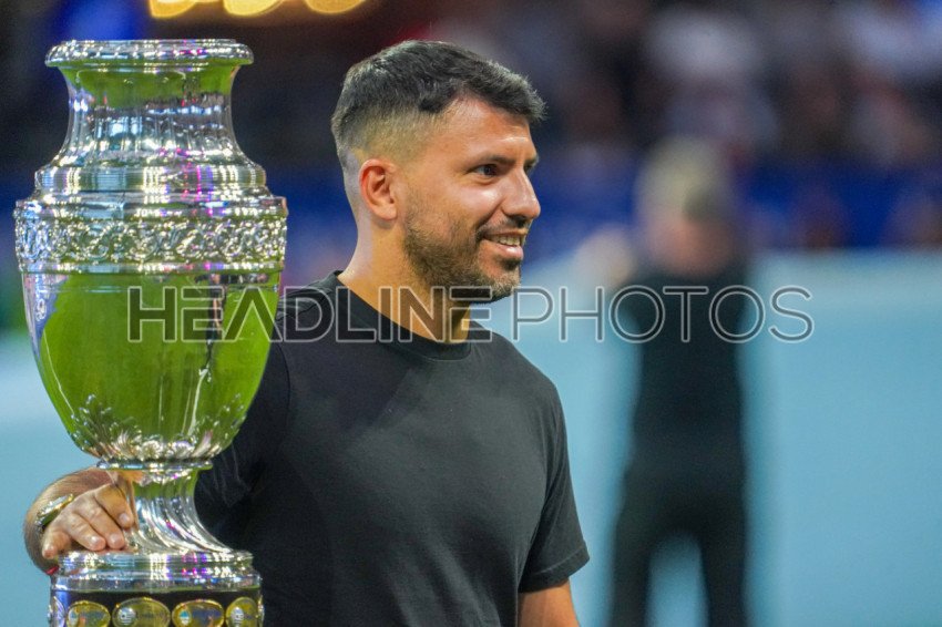 Atlanta, Georgia, USA, June 20, 2024, Argentina and Manchester City legend Sergio 'Kun' Aguero placed the Copa America trophy on the stand during the 2024 Copa America at Mercedes-Benz Stadium. (Photo Credit: Marty Jean-Louis)