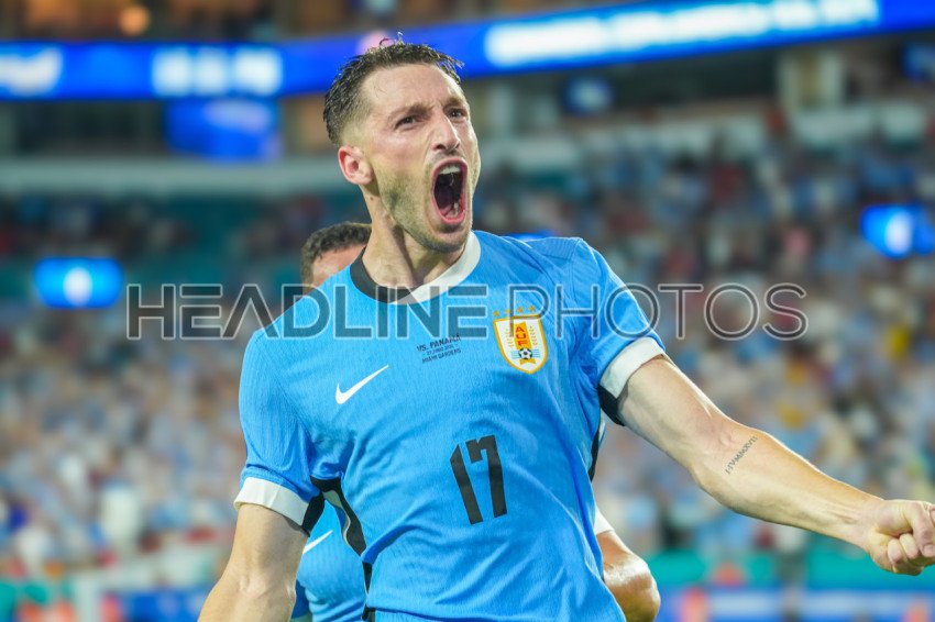 Miami Gardens, Florida, USA, June 20, 2024, Uruguay defender Matías Viña #17 reacts after scoring during the 2024 Copa America at the Hard Rock Stadium. (Photo Credit: Marty Jean-Louis)