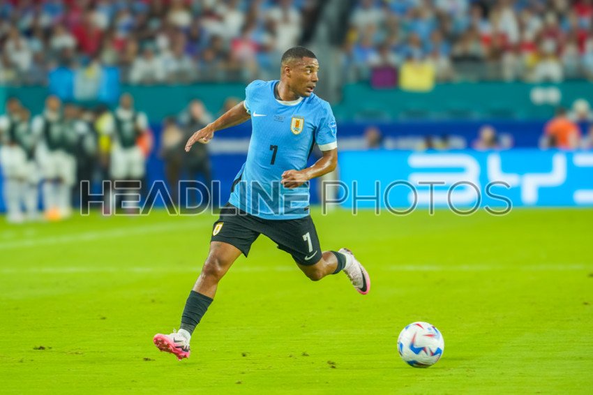 Miami Gardens, Florida, USA, June 20, 2024, Uruguay player Nicolás de la Cruz #7 runs after a pass during the 2024 Copa America at the Hard Rock Stadium. (Photo Credit: Marty Jean-Louis)