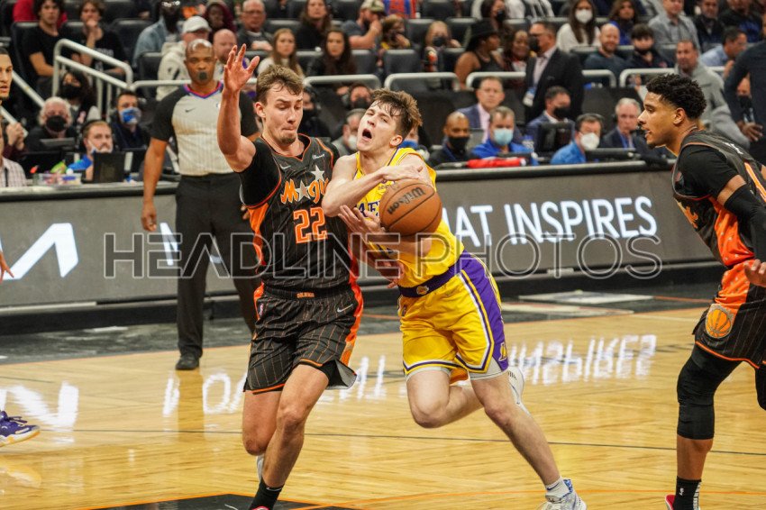 Orlando, Florida, USA, January 21, 2022, Los Angeles Lakers Shooting Guard Austin Reaves #15 is fouled by Franz Wagner #22 during the first half at the Amway Center. (Photo Credit: Marty Jean-Louis)