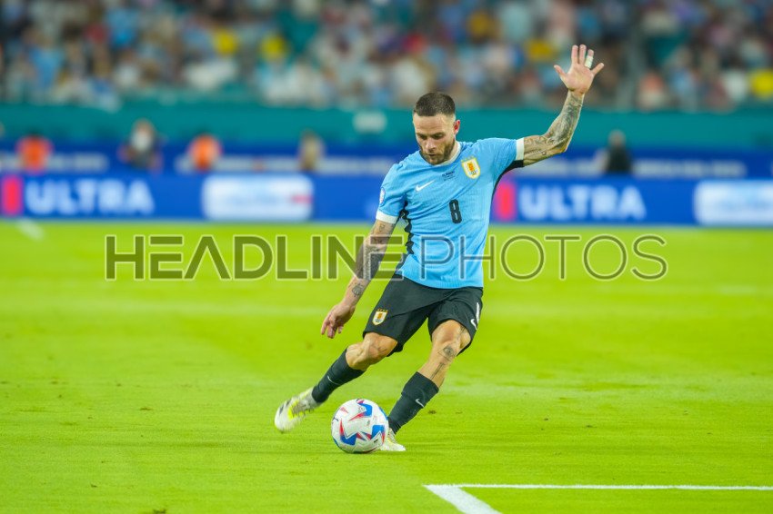 Miami Gardens, Florida, USA, June 20, 2024, Uruguay player Nahitan Nández #8 attempt to score during the 2024 Copa America at the Hard Rock Stadium. (Photo Credit: Marty Jean-Louis)