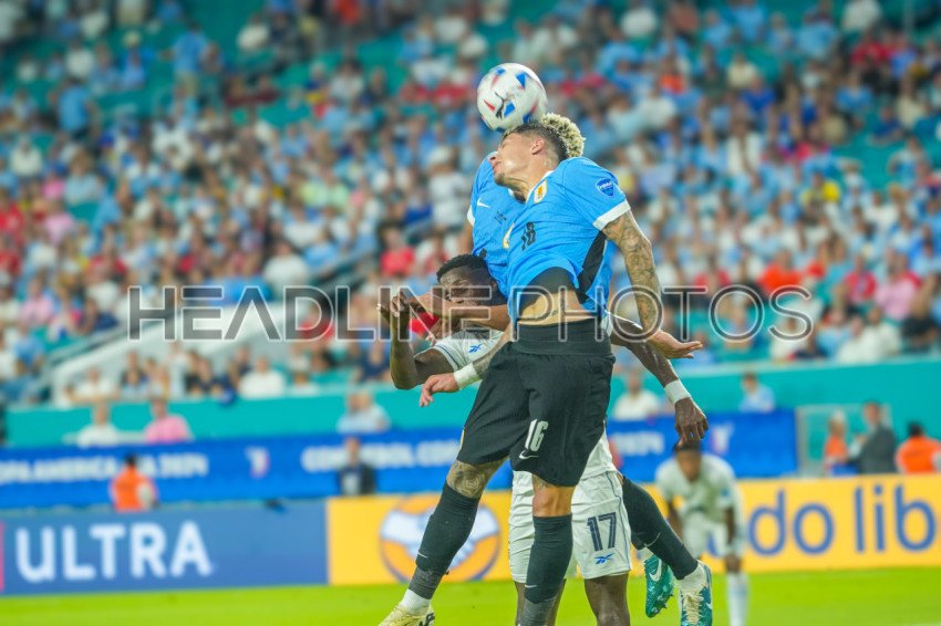 Miami Gardens, Florida, USA, June 20, 2024, Uruguay defender Mathías Olivera #16 wins the header during the 2024 Copa America at the Hard Rock Stadium. (Photo Credit: Marty Jean-Louis)