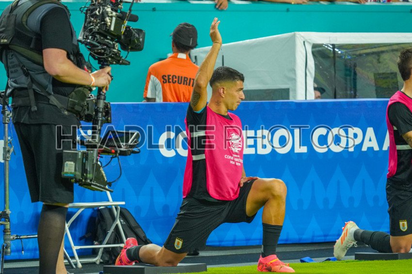 Miami Gardens, Florida, USA, June 20, 2024, Uruguay forward Luis Suarez #9 warming up during the 2024 Copa America at the Hard Rock Stadium. (Photo Credit: Marty Jean-Louis)