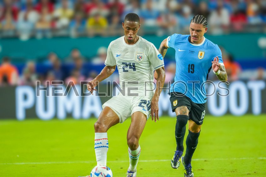 Miami Gardens, Florida, USA, June 20, 2024, Panama defender Edgardo Fariña #24 runs up field as Darwin Núñez #19 runs behind during the 2024 Copa America at the Hard Rock Stadium. (Photo Credit: Marty Jean-Louis)