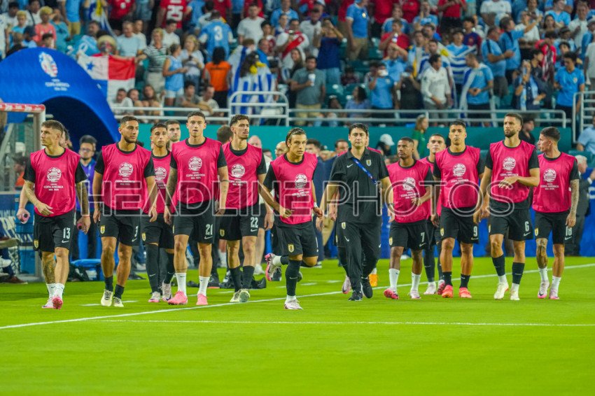 Miami Gardens, Florida, USA, June 20, 2024, Uruguay players enter the field for warm up during the 2024 Copa America at the Hard Rock Stadium. (Photo Credit: Marty Jean-Louis)