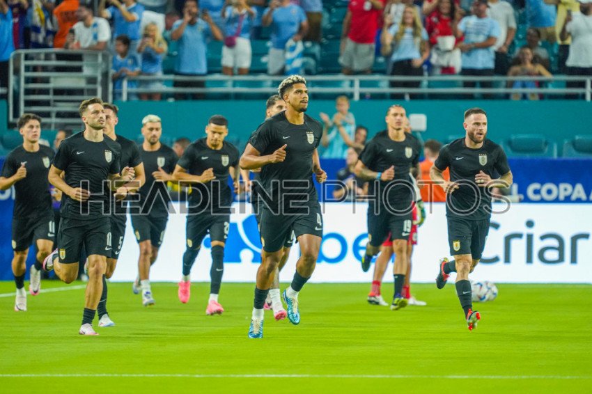 Miami Gardens, Florida, USA, June 20, 2024, Uruguay players enter the field for warm up during the 2024 Copa America at the Hard Rock Stadium. (Photo Credit: Marty Jean-Louis)