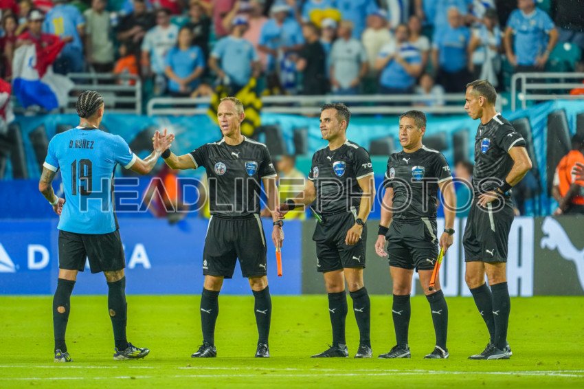 Miami Gardens, Florida, USA, June 20, 2024, Uruguay forward Darwin Núñez #19 shows respect to the Referees post match during the 2024 Copa America at the Hard Rock Stadium. (Photo Credit: Marty Jean-Louis)